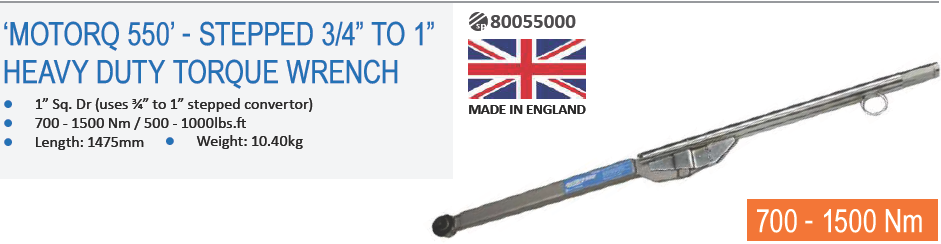 Cờ lê lực Sykes Pickavant Motorq 550, Cờ lê siết lực Sykes Pickavant Motorq 550 (Code: 80055000) là thuộc loại cờ lê lực Sykes Pickavant công nghiệp đầu liền, có dải lực siết: 700 - 1.500 N.m (500 - 1.000 lbs.ft), cỡ khẩu: 1", chuyên dùng để siết lực (moment) chính xác các loại bulong, đai ốc trong công nghiệp.