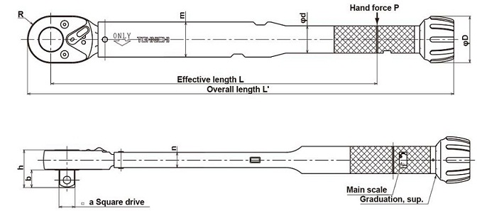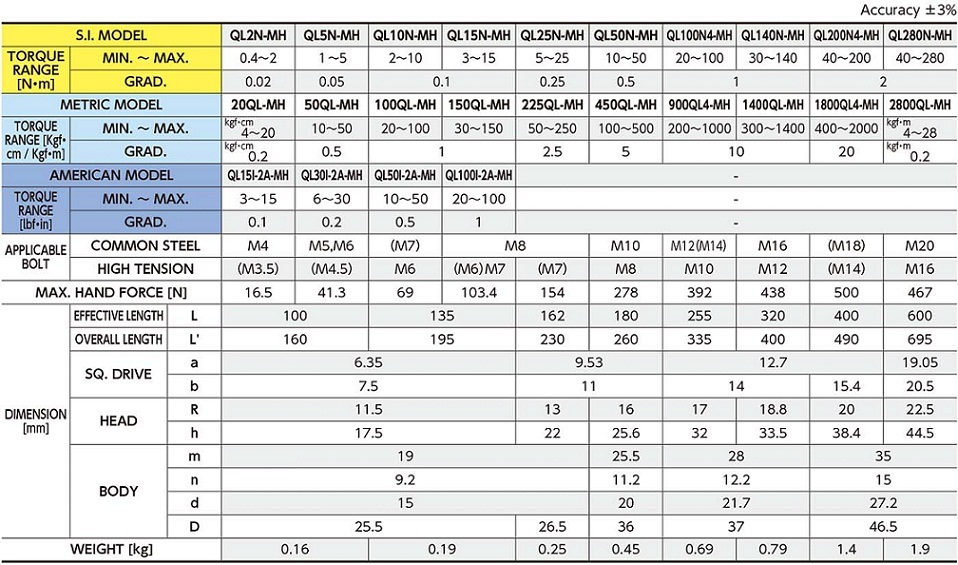 Cờ lê lực Tohnichi QL2N-MH, Tohnichi torque wrench QL2N-MH: thuộc loại cờ lê lực đầu liền, dùng khẩu để siết, với size nhét đầu khẩu: 1/4", dải lực siết: 0.4 - 2 N.m, bước tiến: 0.02 N.m/vạch, sai số theo nhà sản xuất nêu: +/- 3%, chế tạo theo tiêu chuẩn DIN EN ISO 6789:2003 Type II Class A. Chiều dài (L'): 160 mm. Trọng lượng: 0.16 kg.