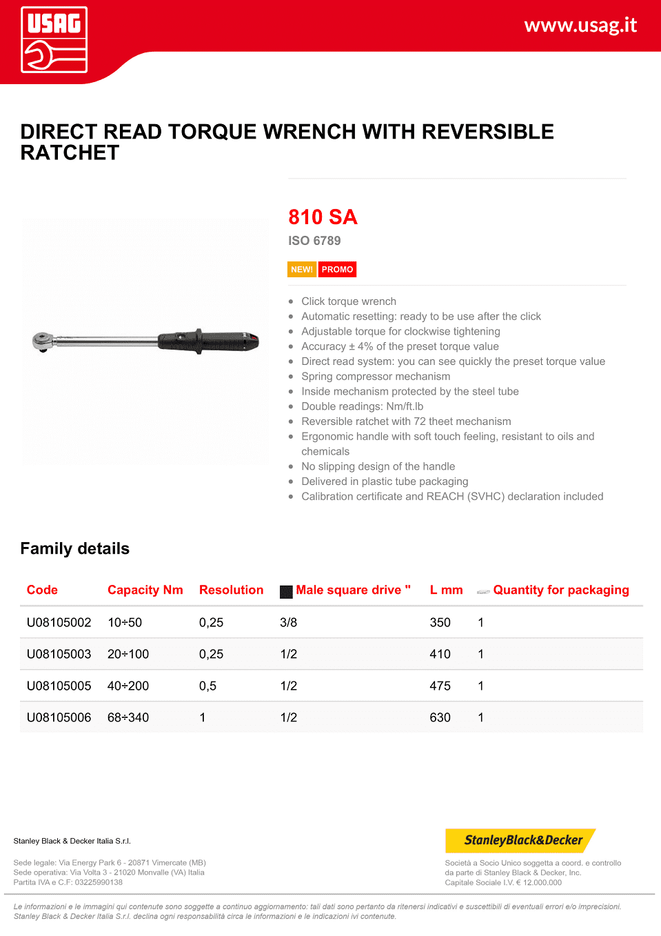 Cờ lê lực USAG U08104003 được chế tạo theo tiêu chuẩn thịnh hành ISO 6789, đi kèm chứng chỉ hiệu chuẩn trước khi xuất xưởng (certificate of calibration).