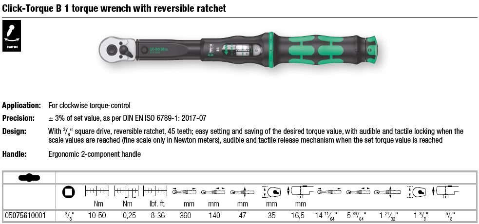 Cờ lê lực Wera 05075610001, cờ lê siết lực Wera 05075610001 thuộc hàng chất lượng cao, chuyên dùng để siết lực (moment) các loại bulong, đai ốc, vít trong công nghiệp. Dải lực siết: 10 - 50 N.m (8 - 36 lbf.ft), bước tiến: 0.25 N.m/vạch, cỡ khẩu: 3/8".