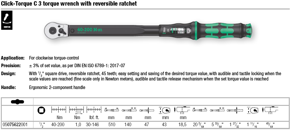 Cờ lê lực Wera 05075622001 chế tạo theo tiêu chuẩn DIN EN ISO 6789-1: 2017-07, với sai số chế tạo: +/-3%. Chiều dài tổng thể: 510 mm. Cơ cấu đảo chiều siết của cờ lê lực Wera 05075622001 dạng tay gạt (trái/phải) cho phép đảo chiều nhanh gọn.