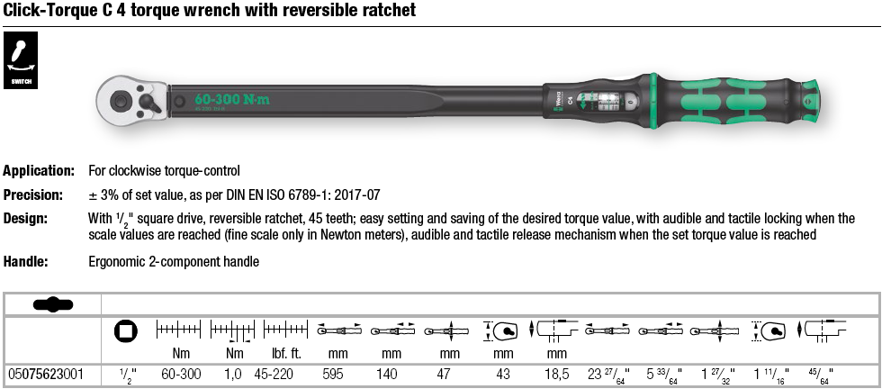Cờ lê lực Wera 05075623001, cờ lê siết lực Wera 05075623001 thuộc hàng chất lượng cao, chuyên dùng để siết lực (moment) các loại bulong, đai ốc, vít trong công nghiệp. Dải lực siết: 60 - 300 N.m (45 - 220 lbf.ft), bước tiến: 1 N.m/vạch, cỡ khẩu: 1/2".