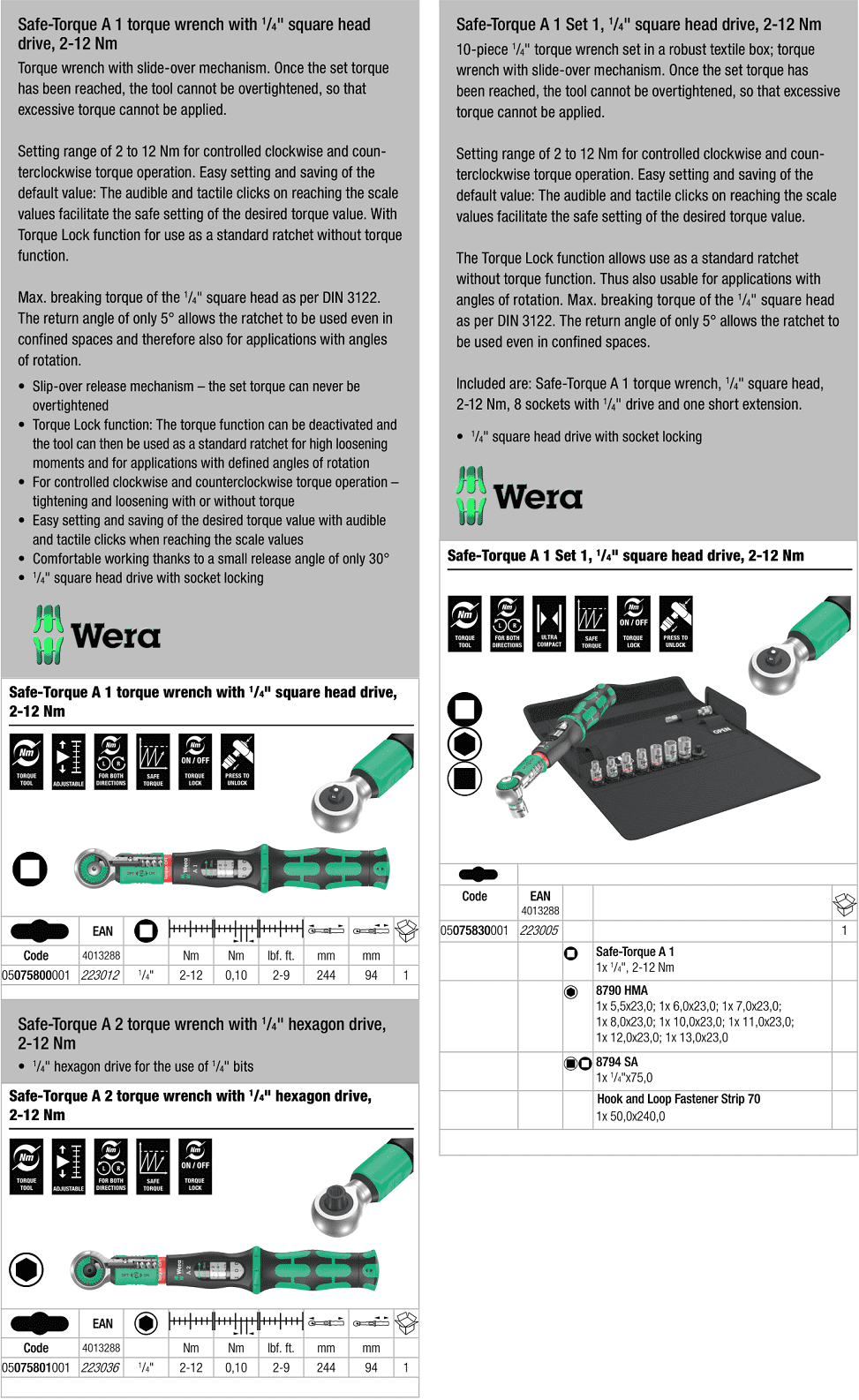 Cờ lê lực Wera 05075800001, cờ lê siết lực Wera 05075800001, Wera torque wrench 05075800001 là loại cờ lê lực cỡ nhỏ, chuyên dùng để siết lực (momen) chính xác trong công nghiệp, với dải lực: 2 - 12 N.m (2 - 9 lbf.ft), bước tiến: 0.1 N.m/vạch (0.1 lbf.ft/vạch), cỡ khẩu 1/4".