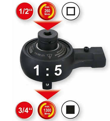Có lực siết max: 1.300 N.m, size khẩu đầu vào: 1/2", size khẩu đầu ra: 3/4", hệ số nhân: 5:1, chuyên dùng siết lực cho các loại bulong, đai ốc, vít ...trong công nghiệp.