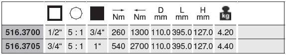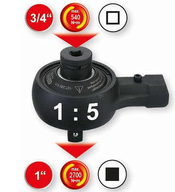 Có lực siết max: 2.700 N.m, size khẩu đầu vào: 3/4", size khẩu đầu ra: 1", hệ số nhân: 5:1, chuyên dùng siết lực cho các loại bulong, đai ốc, vít ...trong công nghiệp.