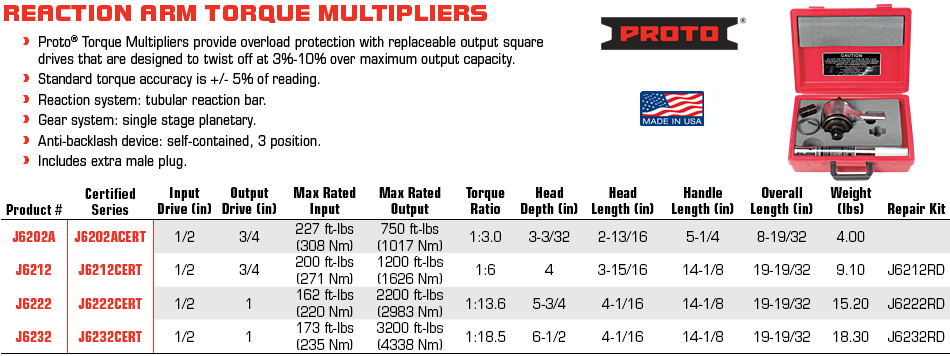 Cờ lê nhân lực Proto J6232, Proto Multiplier torque wrench J6232 chuyên dùng để siết lực chính xác các loại bulong, đai ốc trong công nghiệp lắp. Có dải lực: 173 - 3.200 ft.lbs (235 - 4.338 N.m), hệ số nhân: 18.5 : 1, cỡ khẩu vào: 1/2", cỡ khẩu ra: 1".