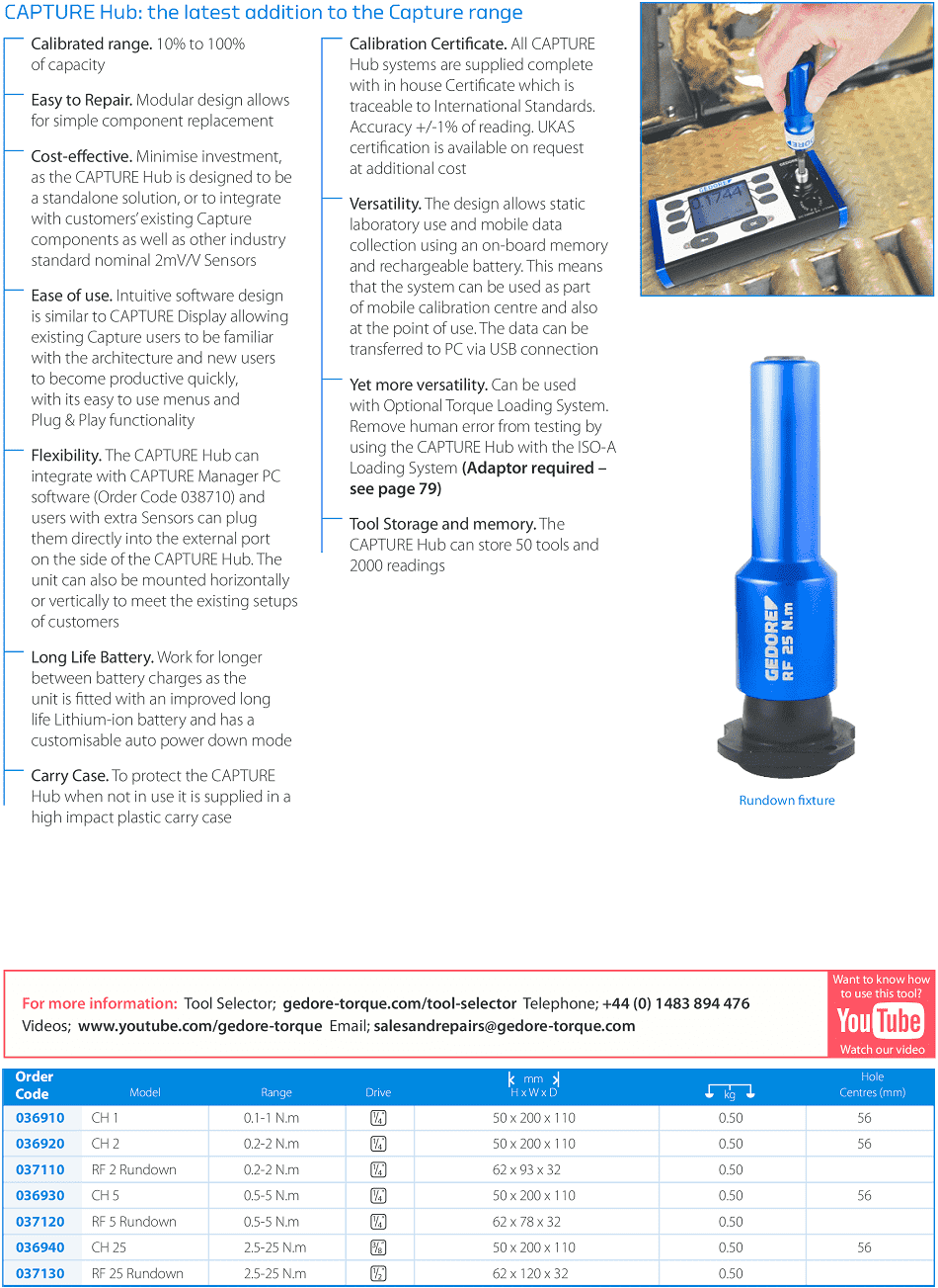 Bộ điều khiển Gedore Capture cho phép cài đặt chương trình với 500 dụng cụ và 2.000 thông số cần setup, truy xuất lại khi cần sử dụng. Với các chế độ đo/test (liên tục, gián đoạn, đo góc...). Sử dụng nguồn: pin Lithium. Kết nối với máy vi tính thông qua cable kết nối dạng khe cắm USB.