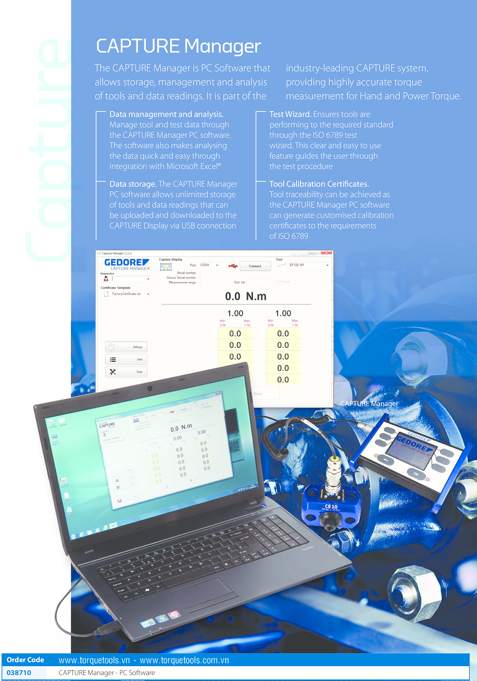 Phầm mềm quản lý dữ liệu Gedore Capture (Capture Manager PC Sofware): dễ sử dụng, định dạng theo chuẩn Microsoft Excel, cho phép lưu, truy xuất, phân tích dữ liệu nhanh chóng.