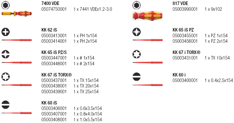 Bộ tô vít lực cách điện VDE Wera 05135906001, bộ tô vít siết lực cách điện VDE Wera 05135906001 là túi dụng cụ 16 chi tiết, gồm: tô vít lực cách điện WERA 7441 VDE (1.2 - 3.0 N.m), 14 chiếc vít cách điện VDE và 1 chiếc tô vít VDE thường đi kèm, chuyên dùng để siết lực (moment) chính xác các loại vít trong môi trường điện cao thế. Đóng gói trong túi vải công nghiệp.