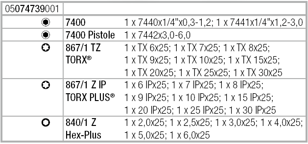 Bộ tô vít lực Wera 7440/41/42, Bộ tô vít siết lực Wera 7440/41/42(Code: 05074739001) gồm 27 chi tiết : 3 chiếc tô vít lực có dải siết 0.3 - 1.2 N.m, 1.2 - 3.0 N.m và 3.0 - 6.0 N.m cùng 24 chiếc đầu vít đi kèm. Đa chức năng trong ứng dụng siết moment chính xác các loại vít.