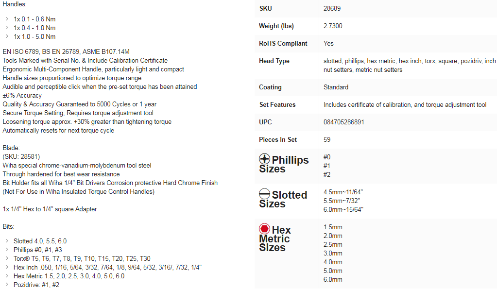 Bộ tô vít lực Wiha 28689 gồm 59 chi tiết, được đóng gói trong hộp nhựa công nghiệp. Bộ tô vít lực Wiha 28689 gồm 3 tô vít lực chính có dải lực siết lần lượt: 0.1 - 0.6 N.m, 0.4 - 1 N.m và 1 - 5 N.m, ngoài việc sử dụng đầu lục hex.1/4", còn trang bị thêm đầu chuyển khẩu sqr.1/4".