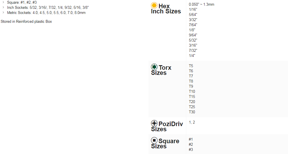 Ngoài 3 tô vít lực chính, đầu lục hex.1/4", đầu chuyển đổi sang khẩu 1/4", còn có: 39 đầu bắt vít (39 insert bits), 14 đầu khẩu (socket) và 1 tô vít lục 1/4".