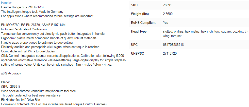 Sai số lực siết theo nhà chế tạo Wiha niêm yết: +/-6%, chế tạo theo tiêu chuẩn EN ISO 6789, BS EN 26789, ASME B107.14M. Theo nhà sản xuất Wiha khuyến cáo, phải 5.000 lần siết hoặc 1 năm mới phải hiệu chuẩn lại.