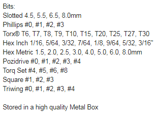 Tô vít lực điện tử sử dụng trong bộ dụng cụ này iTorque 36886. Việc cài đặt chỉ số lực cần siết vẫn thông qua thao tác, mở, vặn khóa đuôi, tiến lên/xuống, quan sát chỉ số nhảy trên màn hình để được chỉ số cài đặt. Việc chuyển đổi đơn vị đo Nm ↔in.lbs / cNm ↔in.oz thông qua phím bấm gán trên thân tô vít lực.