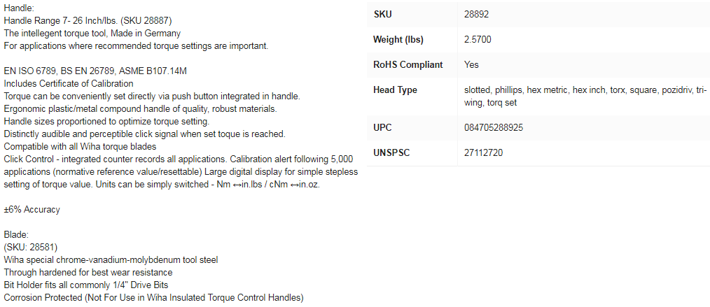 Sai số lực siết theo nhà chế tạo Wiha niêm yết: +/-6%, chế tạo theo tiêu chuẩn EN ISO 6789, BS EN 26789, ASME B107.14M. Theo nhà sản xuất Wiha khuyến cáo, phải 5.000 lần siết hoặc 1 năm mới phải hiệu chuẩn lại.