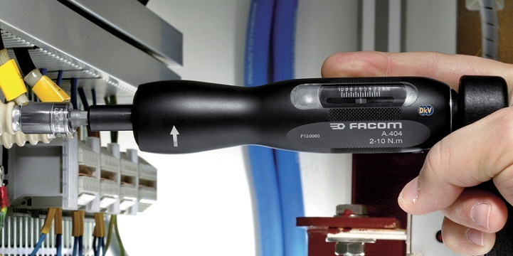 Tô vít lực Facom A.404, Facom torque screwdriver A.404 có dải lực siết: 2 - 10 N.m, bước tiến: 0.5 N.m/vạch, size nhét đầu vít lục giác 1/4", chuyên dùng để siết lực (moment) chính xác các loại vít trong công nghiệp.