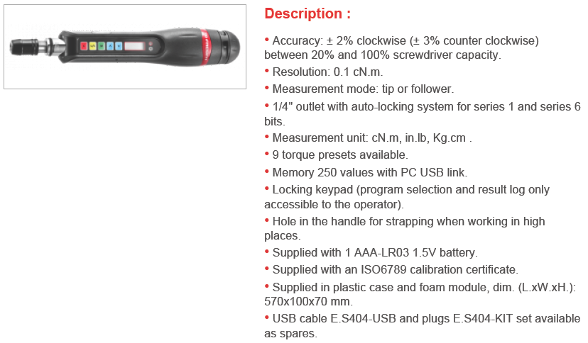 Trong đó Tô vít siết lực điện tử Facom E.S404 sử dụng pin: 1.5V 1 AAA-LR03 có sai số do nhà chế tạo Facom niêm yết: +/-2%, bước tiến: 0.1 cN.m. Sử dụng các đơn vị đo: cN.m, kgf.cm, in.lb, việc chuyển đổi đơn vị đo diễn ra nhanh chóng nhờ thao tác trên phím bấm hoặc cài đặt từ PC.