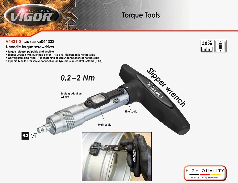 Tô vít lực Vigor V4431-2, Tô vít siết lực Vigor V4431-2 là loại tô vít siết lực chính xác các loại vít trong công nghiệp, có dải lực: 0.2 - 2 N.m, bước tiến: 0.1 N.m/vạch, sai số chế tạo: +/- 6%, cỡ khẩu 1/4".