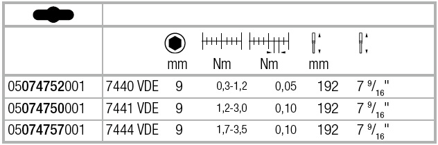 Tô vít lực cách điện Wera 7441 VDE, tô vít siết lực Wera 7441 VDE, Wera torque wrench 7441 VDE (Code: 05074750001) là loại tô vít lực cách điện, có dải lực siết: 1.2 - 3.0 N.m, bước tiến: 0.1 N.m/vạch, size bit: lục 9 mm.Tô vít lực cách điện Wera 7441 VDE chuyên dùng để siết chính xác lực đối với các vít, trong môi trường điện cao thế (< 1.000 V).